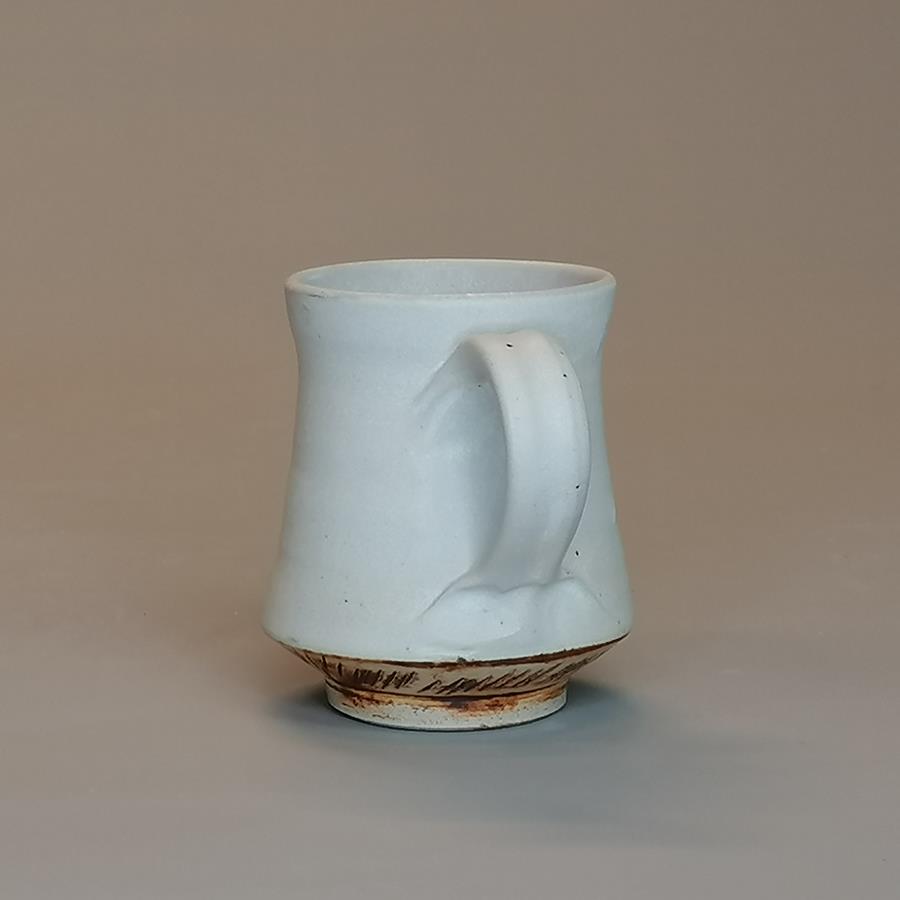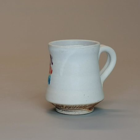 Wheel thrown stoneware mug with pulled handle. Stoneware glaze with brushed high fire colour and oxide decoration.